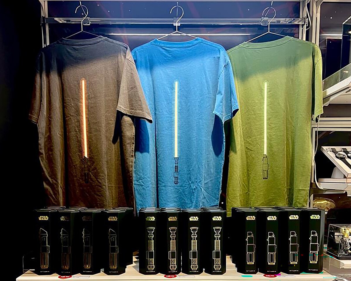 ライトセーバーのBOXに入ったTシャツは、ライトセーバーのデザイン部分に蓄光プリントを施し、フォースのエネルギーと共鳴し、ライトセーバーが光る様子を表現した注目のアイテムです。